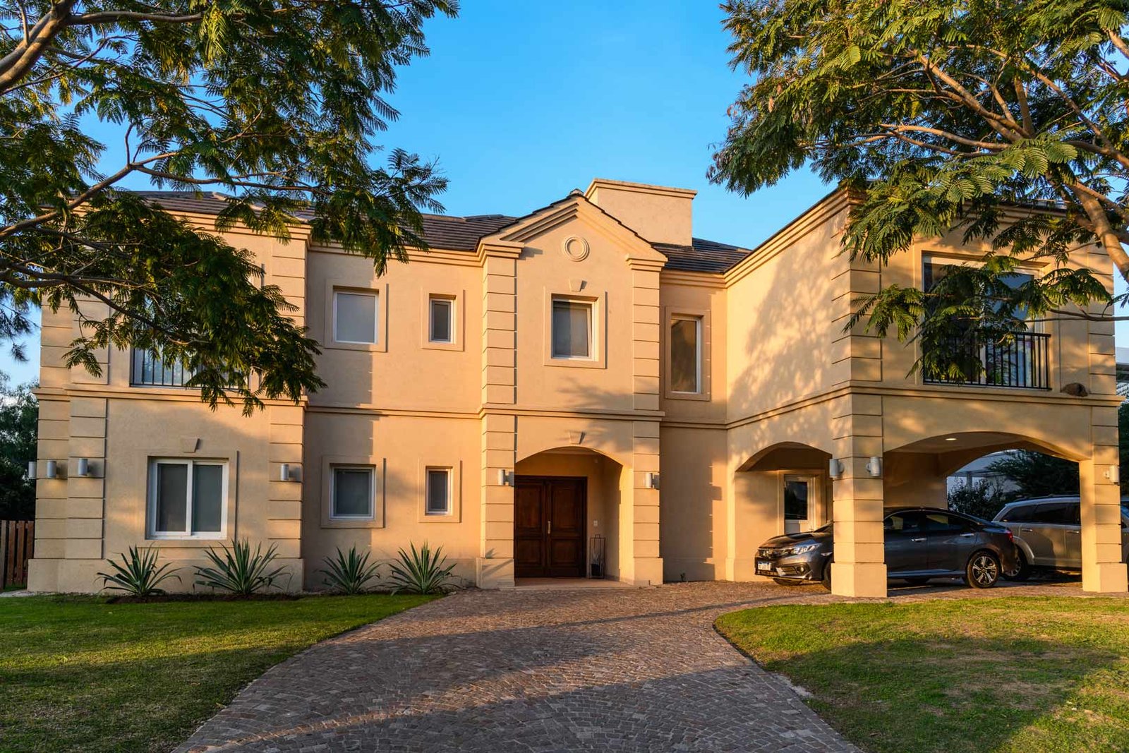 El frente simétrico de la gran residencia neoclásica, impone con su lenguaje arquitectónico culto y elegante.