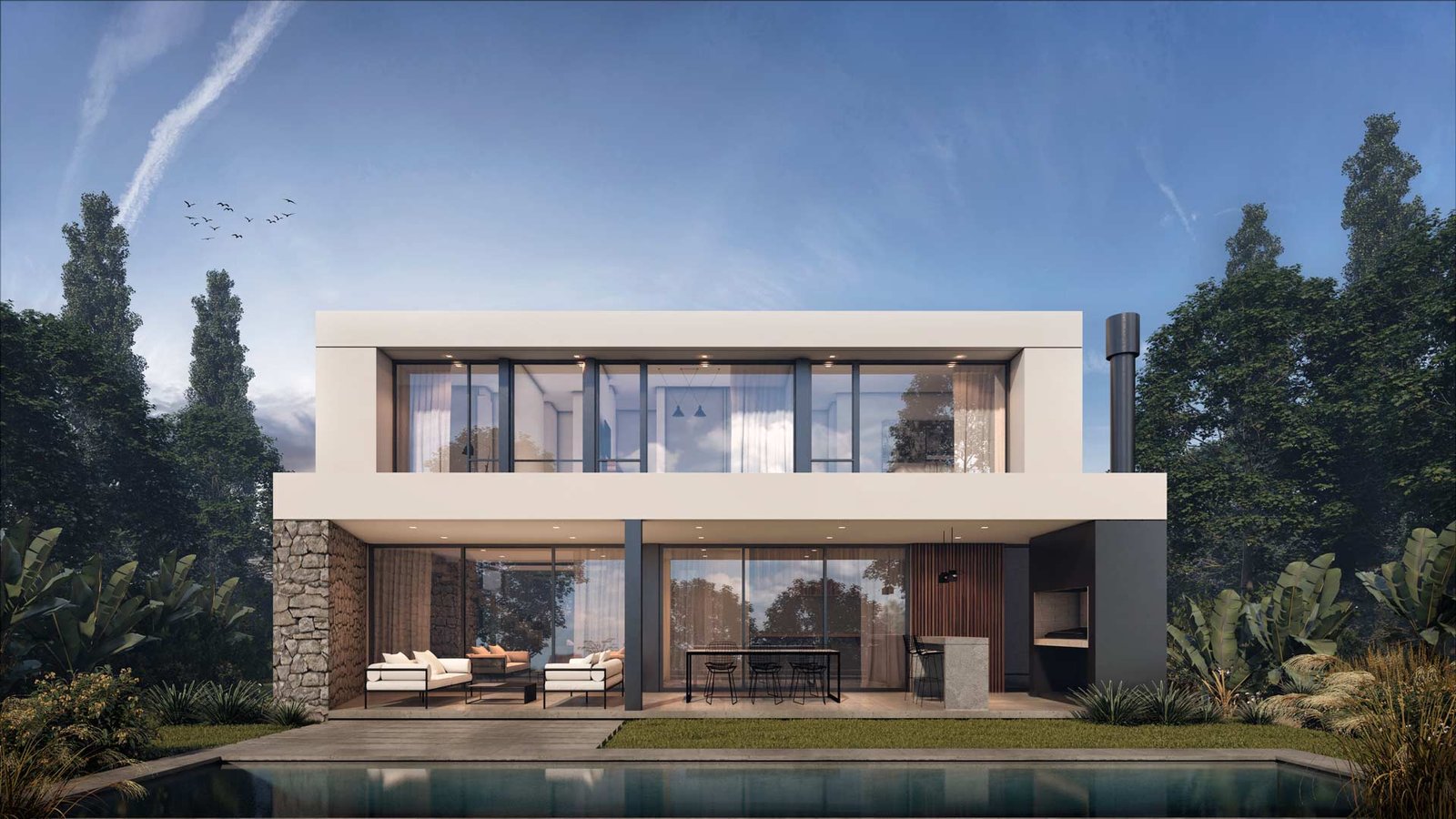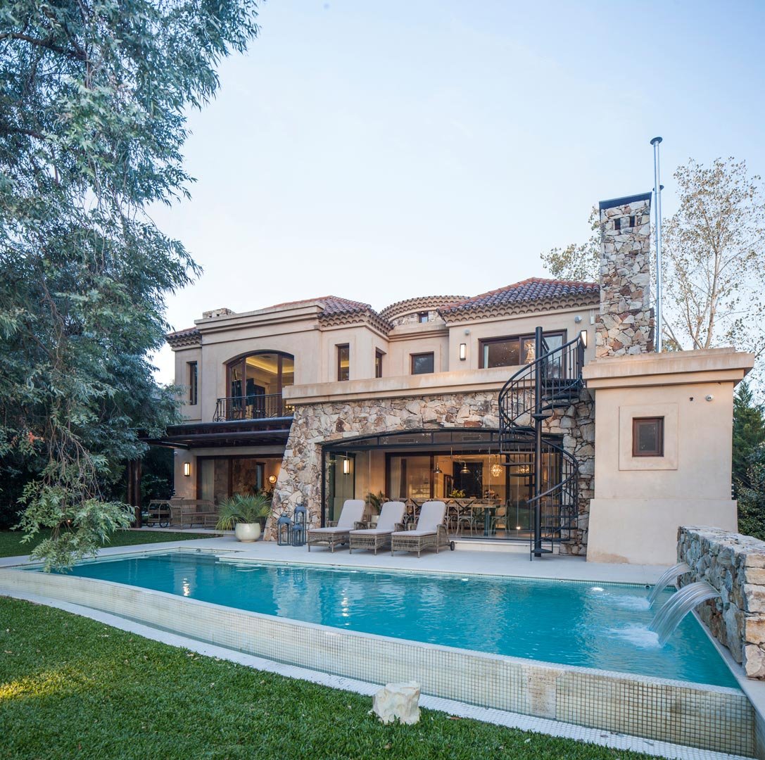 La villa estilo italiano se extiende en el terreno en íntimo diálogo con el lago. Su extensa superficie cubierta se corporiza en fachadas armónicas, distintas alturas de cubiertas y una sucesión de aventanamientos en cuidado juego de proporciones.