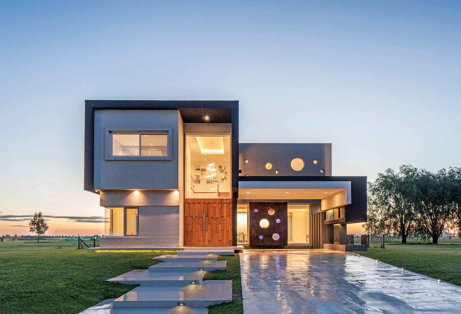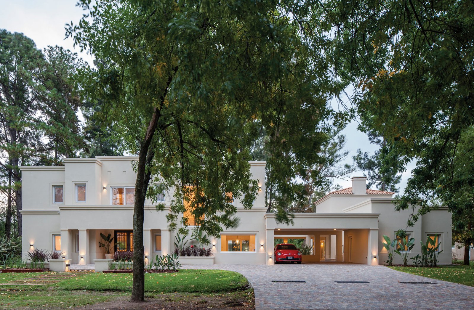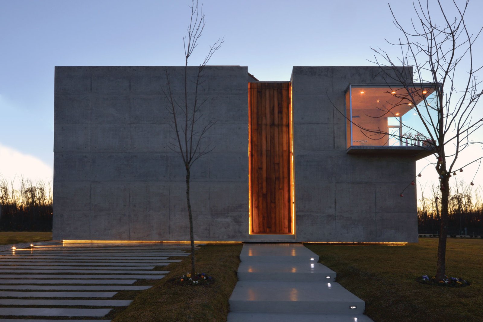Pequeñas plateas superpuestas de hormigón elevan respecto de la calle el acceso principal jerarquizándolo.