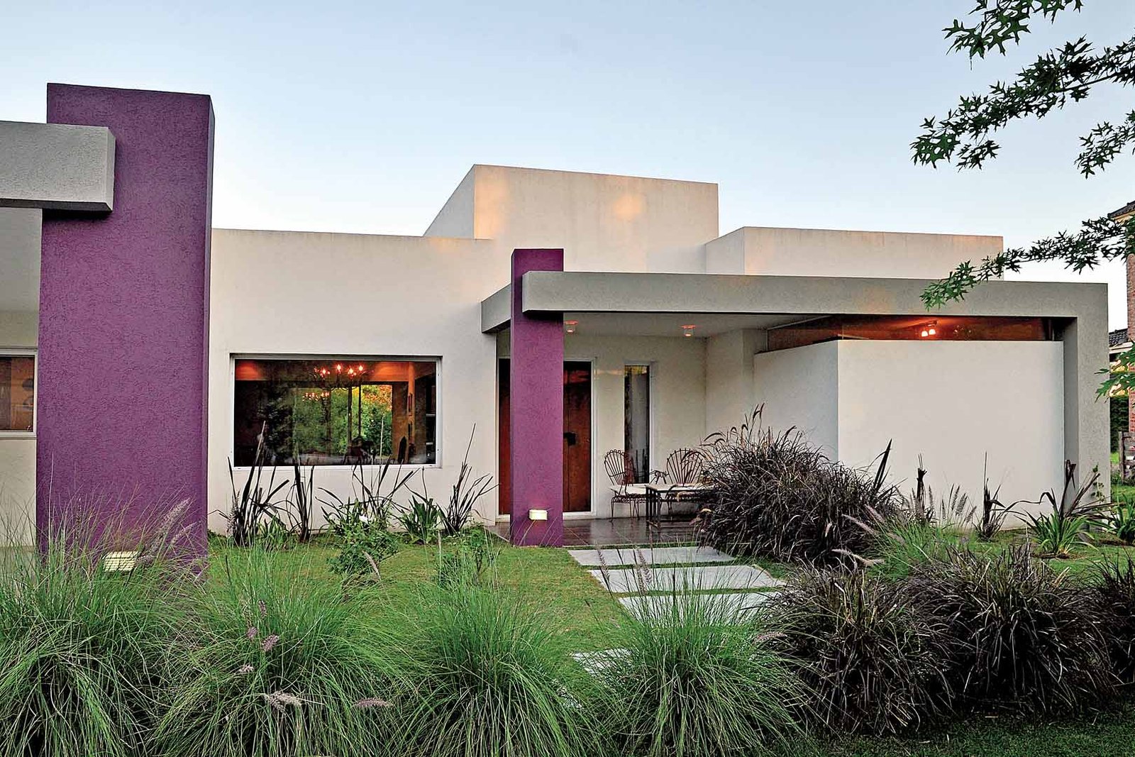 Volúmenes blancos de distintas alturas, combinados con rajas vidriadas y columnas de colores fuertes, componen una fachada actual.