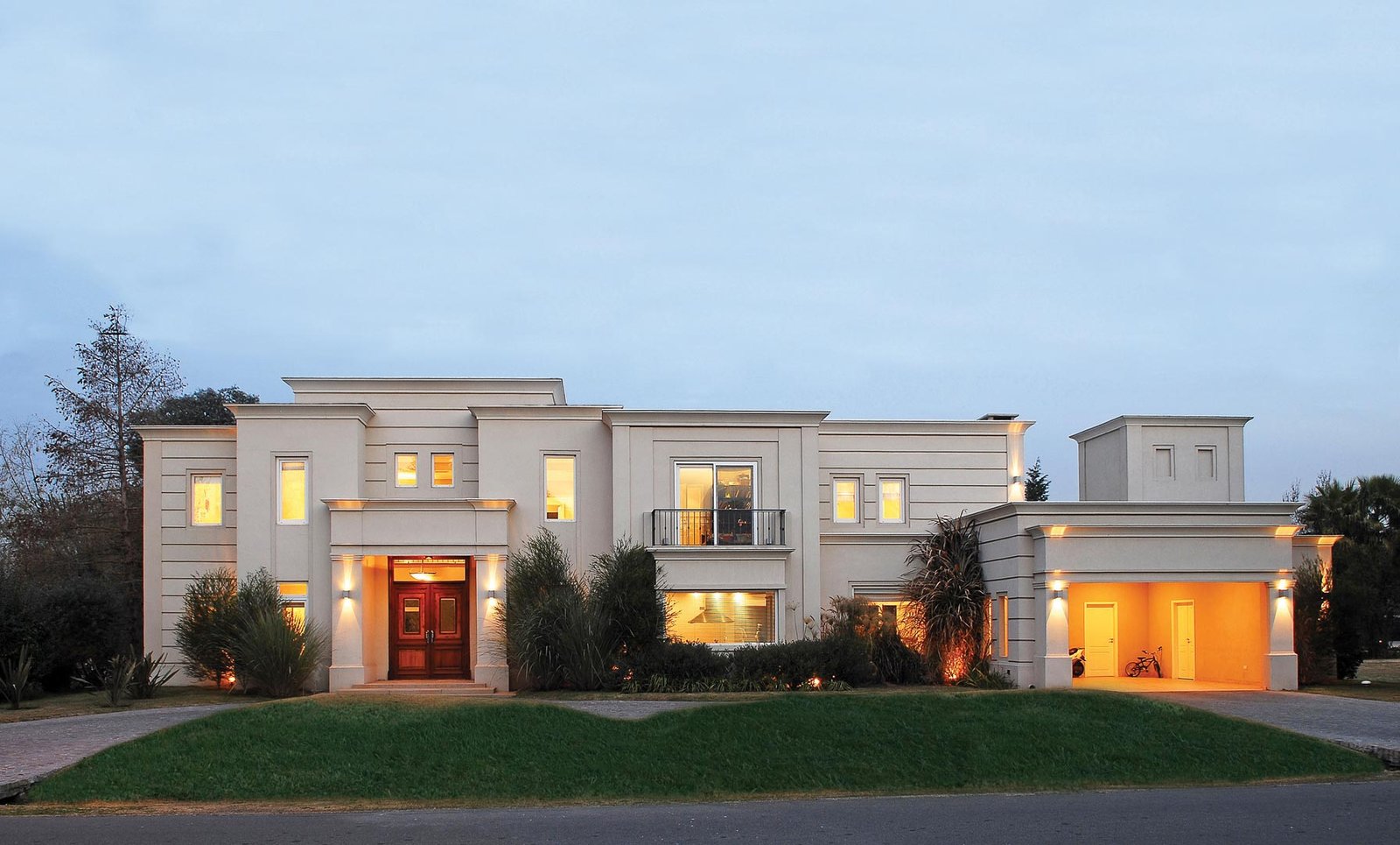 Los grandes volúmenes de piedra pirca de Bariloche, que enmarcan el pórtico de acceso principal, terminan de definir el estilo y le dan un fuerte carácter a la fachada. En el atrio creado entre los volúmenes, luce la importante puerta de entrada, realizada en madera maciza con aldabones y tachas de hierro color óxido.