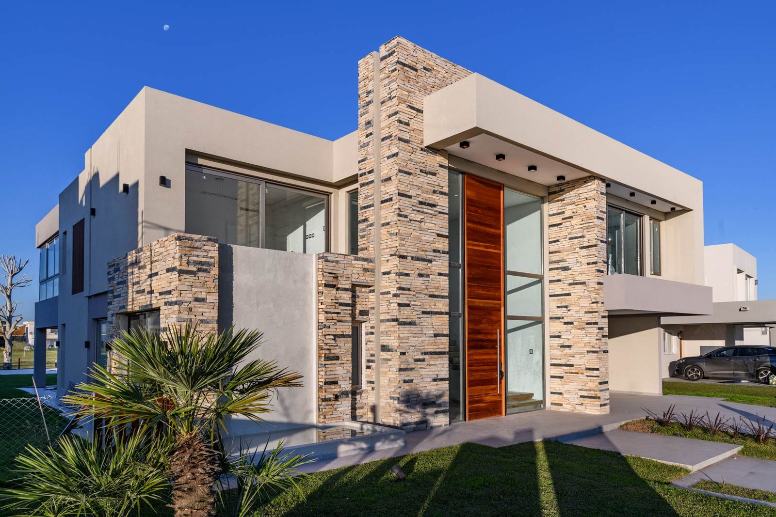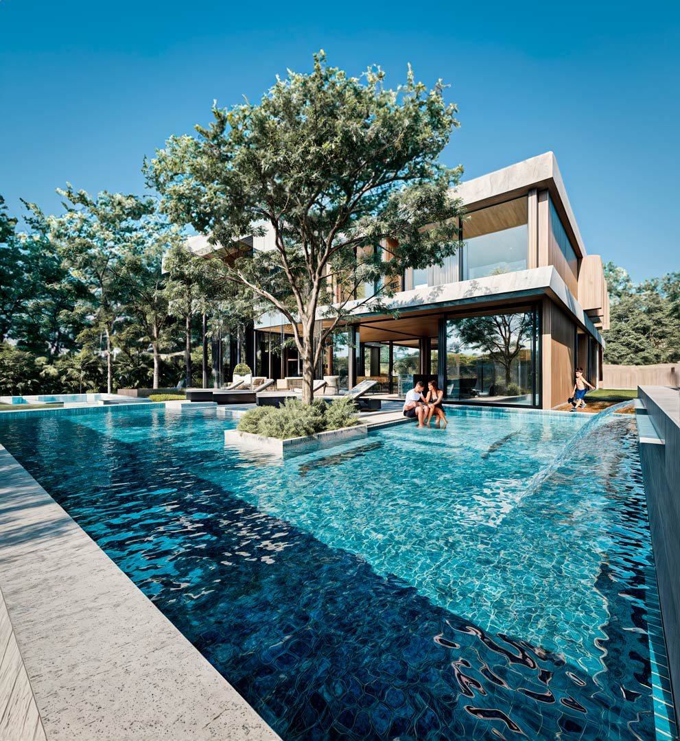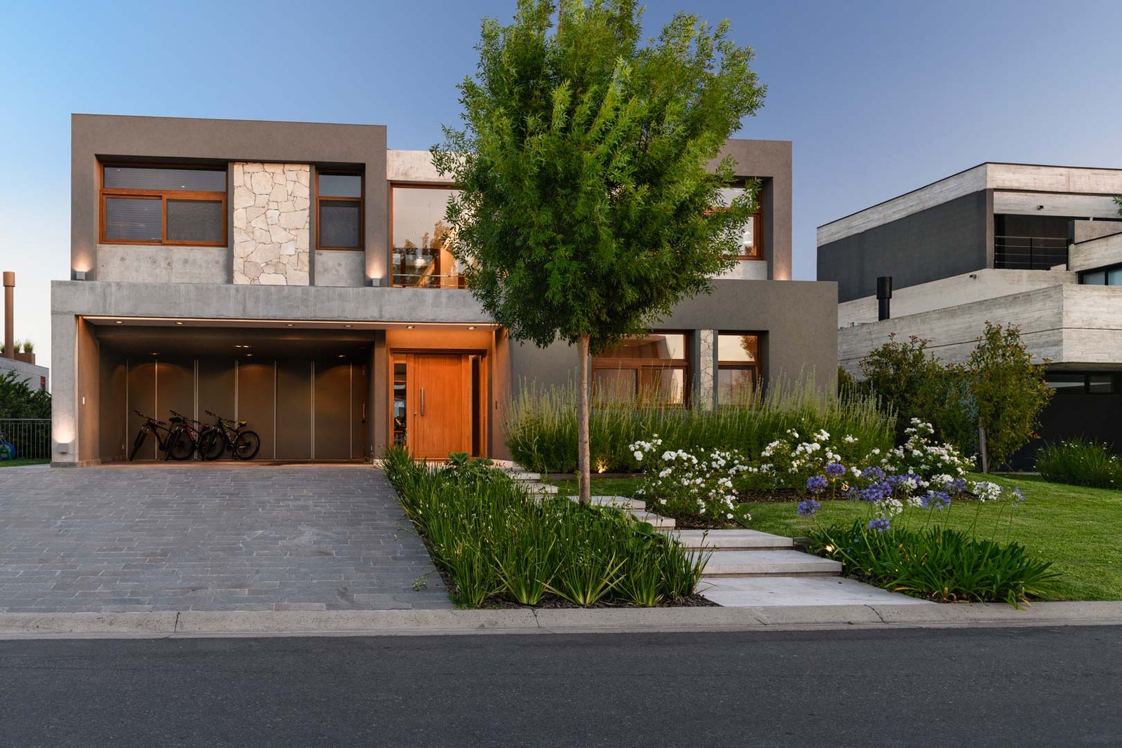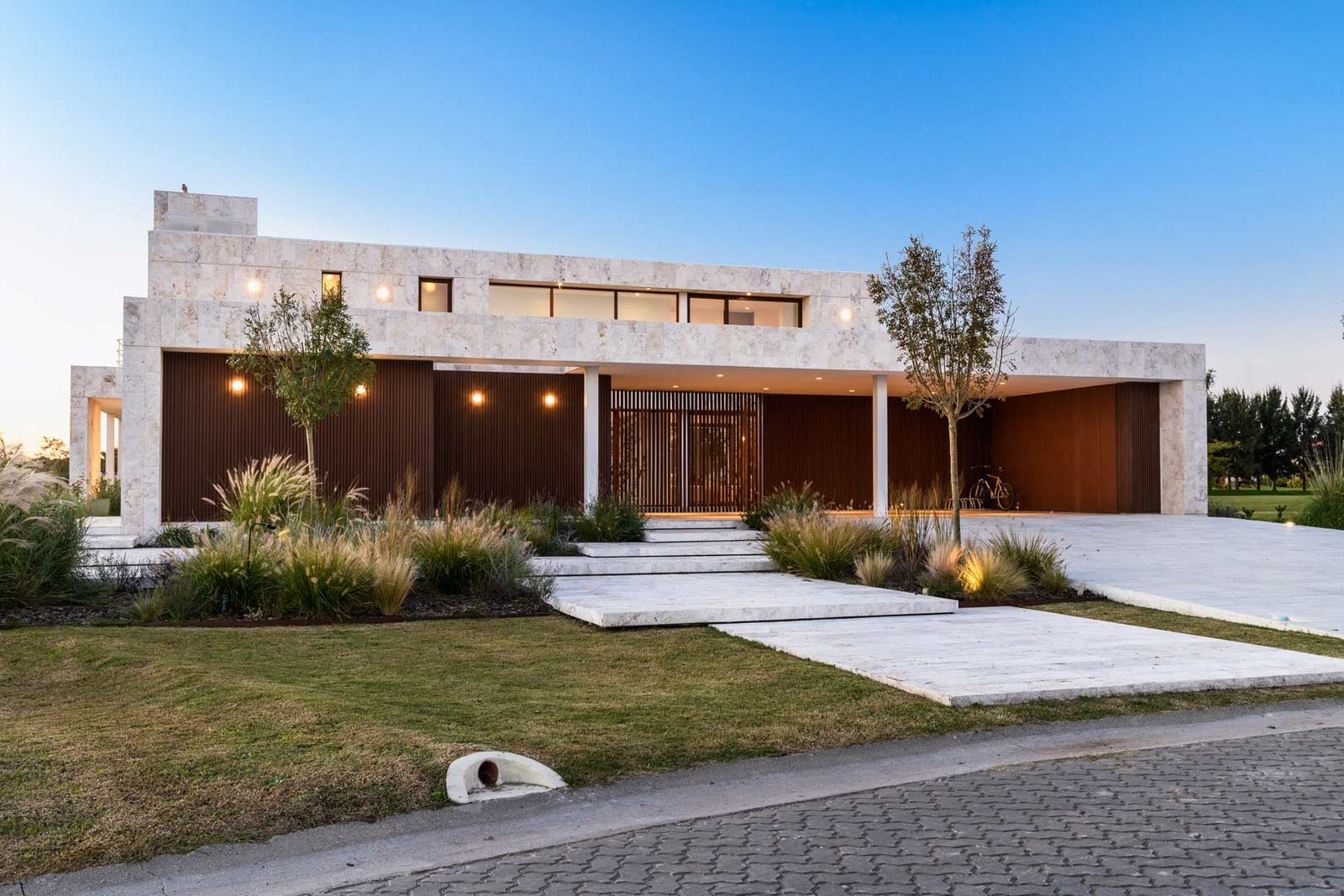 Con una volumetría cúbica, fuerte, revestida con mármol travertino, la casa provoca y atrae a partir del diseño de la fachada, que la cierra hacia el frente, protegiéndola de las miradas.